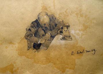 | Keywords: Ludwig Scheuermann (1859 in Burghersdorp - 1911 in Herrsching) - Ludwig schlafend.jpg de Ludwig schlafend originale weißgehöhte Bleistiftzeichnung auf braunem Papier ca 25x34cm; unten rechts signiert und datiert L Sch Jan 18 89 von Ludwig Scheuermann 1859 in Burghersdorp/Südafrika - 1911 in Herrsching Blatt aus dem Album/Gästebuch aus den Jahren 1886 - 1898 der Münchner Mittwochsgesellschaft die der Verleger Hugo Bruckmann 1863 - 1941 im Zentral-Café Ungerer Dachauer Str 9 gegründet hatte Unter den Mitgliedern waren neben Scheuermann und Bruckmann der Verleger Edgar Hanfstaengl 1842-1910 die Maler August Leonhardi 1867 - 1931 Anton Mangold 1863 - 1907 und Moritz Röbbecke 1857 - 1916 Winfried von Miller 1854 - 1925 und Otto Seitz 1846 - 1912 1889-01 http //www zvab com/servlet/BookDetailsPL bi 16142642405 searchurl kn 3Daugust 2520otto 2520krug 26hl 3Don 26sortby 3D20 Ludwig Scheuermann 1859 in Burghersdorp/Südafrika - 1911 in Herrsching other versions PD-Art Ludwig Scheuermann |