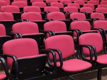 Keywords: luggage conference red chairs presentation gala nobody empty seats places