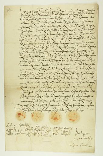 Keywords: Łukasz z Górki wojewoda kaliski i inni zaświadczają, że odebrali sumy jakiś czas na ratuszu poznańskim przechowywane.png accession number 53/474/D/31 place of creation Poznań Cztery pieczęcie wyciśnięte przez papier i podpisy czterech pełnomocników cc-zero Historical documents of Poznań Łukasz III Górka State Archive in Poznań Uploaded with VicuñaUploader |