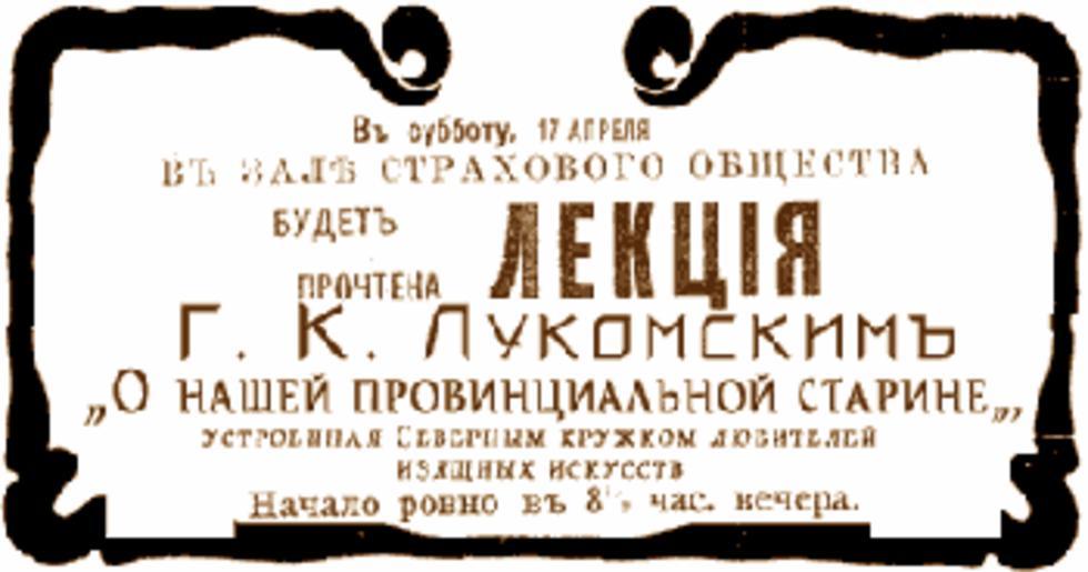 | Keywords: Lukomsky lecture ad.gif en Georgy Lukomsky's 1913's Vologda lecture ad ru Рекламное объявление о лекции Г К Лукомского в Вологде 1913 http //www booksite ru/fulltext/nep/ein/vol/ogda/hronica/lucomsky htm author 1913 PD-RusEmpire Northern Society of Fine Art Lovers Georgy Lukomsky |