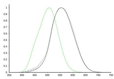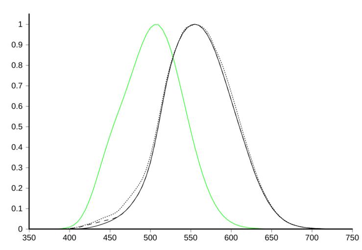 | Keywords: Luminosity.svg Graph of photopic luminosity function black including CIE 1931 solid Judd-Vos modified dashed and Sharpe Stockman Jagla Jägle 2005 dotted ; and scotopic luminosity function CIE 1951 green Using data from http //web archive org/web/20070927222337/http //www cvrl org/database/text/lum/ssvl2 htm http //www cvrl org/database/text/lum/ssvl2 htm “ Sharpe Stockman Jagla Jägle http //web archive org/web/20081228083025/http //www cvrl org/database/text/lum/vljv htm http //www cvrl org/database/text/lum/vljv htm “ Judd “Vos http //web archive org/web/20081228084047/http //www cvrl org/database/text/cmfs/ciexyz31 htm http //www cvrl org/database/text/cmfs/ciexyz31 htm “ CIE 1931 the Y column of XYZ data http //web archive org/web/20081228115119/http //www cvrl org/database/text/lum/scvl htm http //www cvrl org/database/text/lum/scvl htm “ Scotopic CIE 1951 The horizontal axis is wavelength in nanometers 2006-07-27 https //commons wikimedia org/wiki/File Luminosity png original image Dicklyon wikipedia en this version Innesw other versions file Luminosity png o Charts SVG with the following call <poem> invoke Charts SVG lineChart Luminosity Graph of photopic luminosity function black including CIE 1931 solid Judd-Vos modified dashed and Sharpe Stockman Jagla and Jagle 2005 dotted ; and scotopic luminosity function CIE 1951 green An SVG version of the image at https //commons wikimedia org/wiki/File Luminosity png 600 400 20 350 750 50 none 0 1 05 0 1 none none CIE 1931 000 360 0 000003917000 365 0 000006965000 370 0 000012390000 375 0 000022020000 380 0 000039000000 385 0 000064000000 390 0 000120000000 395 0 000217000000 400 0 000396000000 405 0 000640000000 410 0 001210000000 415 0 002180000000 420 0 004000000000 425 0 007300000000 430 0 011600000000 435 0 016840000000 440 0 023000000000 445 0 029800000000 450 0 038000000000 455 0 048000000000 460 0 060000000000 465 0 073900000000 470 0 090980000000 475 0 112600000000 480 0 139020000000 485 0 169300000000 490 0 208020000000 495 0 258600000000 500 0 323000000000 505 0 407300000000 510 0 503000000000 515 0 608200000000 520 0 710000000000 525 0 793200000000 530 0 862000000000 535 0 914850100000 540 0 954000000000 545 0 980300000000 550 0 994950100000 555 1 000000000000 560 0 995000000000 565 0 978600000000 570 0 952000000000 575 0 915400000000 580 0 870000000000 585 0 816300000000 590 0 757000000000 595 0 694900000000 600 0 631000000000 605 0 566800000000 610 0 503000000000 615 0 441200000000 620 0 381000000000 625 0 321000000000 630 0 265000000000 635 0 217000000000 640 0 175000000000 645 0 138200000000 650 0 107000000000 655 0 081600000000 660 0 061000000000 665 0 044580000000 670 0 032000000000 675 0 023200000000 680 0 017000000000 685 0 011920000000 690 0 008210000000 695 0 005723000000 700 0 004102000000 705 0 002929000000 710 0 002091000000 715 0 001484000000 720 0 001047000000 725 0 000740000000 730 0 000520000000 735 0 000361100000 740 0 000249200000 745 0 000171900000 750 0 000120000000 Judd Vos 1978 000 1 380 2 00000e-004 385 3 95560e-004 390 8 00000e-004 395 1 54570e-003 400 2 80000e-003 405 4 65620e-003 410 7 40000e-003 415 1 17790e-002 420 1 75000e-002 425 2 26780e-002 430 2 73000e-002 435 3 25840e-002 440 3 79000e-002 445 4 23910e-002 450 4 68000e-002 455 5 21220e-002 460 6 00000e-002 465 7 29420e-002 470 9 09800e-002 475 1 12840e-001 480 1 39020e-001 485 1 69870e-001 490 2 08020e-001 495 2 58080e-001 500 3 23000e-001 505 4 05400e-001 510 5 03000e-001 515 6 08110e-001 520 7 10000e-001 525 7 95100e-001 530 8 62000e-001 535 9 15050e-001 540 9 54000e-001 545 9 80040e-001 550 9 94950e-001 555 1 00010e+000 560 9 95000e-001 565 9 78750e-001 570 9 52000e-001 575 9 15580e-001 580 8 70000e-001 585 8 16230e-001 590 7 57000e-001 595 6 94830e-001 600 6 31000e-001 605 5 66540e-001 610 5 03000e-001 615 4 41720e-001 620 3 81000e-001 625 3 20520e-001 630 2 65000e-001 635 2 17020e-001 640 1 75000e-001 645 1 38120e-001 650 1 07000e-001 655 8 16520e-002 660 6 10000e-002 665 4 43270e-002 670 3 20000e-002 675 2 34540e-002 680 1 70000e-002 685 1 18720e-002 690 8 21000e-003 695 5 77230e-003 700 4 10200e-003 705 2 92910e-003 710 2 09100e-003 715 1 48220e-003 720 1 04700e-003 725 7 40150e-004 730 5 20000e-004 735 3 60930e-004 740 2 49200e-004 745 1 72310e-004 750 1 20000e-004 Sharpe Stockman Jagla and Jagle 2005 000 5 390 4 12756E-04 395 1 05612E-03 400 2 44770E-03 405 4 96958E-03 410 9 09091E-03 415 1 43599E-02 420 2 04430E-02 425 2 64573E-02 430 3 37516E-02 435 4 24528E-02 440 5 15395E-02 445 5 89468E-02 450 6 65381E-02 455 7 44724E-02 460 8 76599E-02 465 1 09126E-01 470 1 33622E-01 475 1 57734E-01 480 1 83480E-01 485 2 11584E-01 490 2 43420E-01 495 2 91183E-01 500 3 55216E-01 505 4 35496E-01 510 5 29068E-01 515 6 29792E-01 520 7 27593E-01 525 8 03871E-01 530 8 66113E-01 535 9 14672E-01 540 9 60675E-01 545 9 85933E-01 550 9 91604E-01 555 9 99867E-01 560 9 94596E-01 565 9 85346E-01 570 9 65252E-01 575 9 31320E-01 580 8 82150E-01 585 8 41313E-01 590 7 91676E-01 595 7 32643E-01 600 6 68792E-01 605 6 03383E-01 610 5 35157E-01 615 4 67546E-01 620 4 02633E-01 625 3 42562E-01 630 2 82310E-01 635 2 28481E-01 640 1 83383E-01 645 1 45807E-01 650 1 12327E-01 655 8 44738E-02 660 6 27099E-02 665 4 60308E-02 670 3 34321E-02 675 2 39806E-02 680 1 69708E-02 685 1 18407E-02 690 8 12855E-03 695 5 65663E-03 700 3 93762E-03 705 2 73166E-03 710 1 87275E-03 715 1 28298E-03 720 8 86702E-04 725 6 13604E-04 730 4 27686E-04 735 2 98523E-04 740 2 08205E-04 745 1 47019E-04 750 1 03683E-04 Scotopic CIE 1951 0f0 380 5 890e-004 385 1 108e-003 390 2 209e-003 395 4 530e-003 400 9 290e-003 405 1 852e-002 410 3 484e-002 415 6 040e-002 420 9 660e-002 425 1 436e-001 430 1 998e-001 435 2 625e-001 440 3 281e-001 445 3 931e-001 450 4 550e-001 455 5 130e-001 460 5 670e-001 465 6 200e-001 470 6 760e-001 475 7 340e-001 480 7 930e-001 485 8 510e-001 490 9 040e-001 495 9 490e-001 500 9 820e-001 505 9 980e-001 510 9 970e-001 515 9 750e-001 520 9 350e-001 525 8 800e-