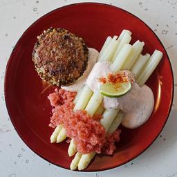Keywords: lumpfish roe lemon roe cutlet white asparagus asparagus giblets dressing food dining served first course