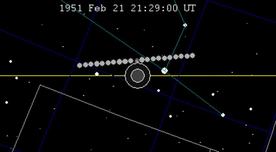 Keywords: Lunar eclipse chart-1951Feb21.png en wikipedia 2011 October 24 February 1951 lunar eclipse chart The position of the moon and earth's shadow are shown as viewed from center of earth A small parallax effect occurs from specific location on surface of the earth The yellow line is the plane of the ecliptic path of the sun through the sky and hence the center of the earth's shadow The two concentric circles centered on this line show the extent of the umbra and penumbra the zones of full and partial shadow respectively for an object in the moon's orbit The moon is drawn at maximum eclipse and circles for every hour interval of motion thumb 2009-04-11 Own SockPuppetForTomruen wikipedia en SockPuppetForTomruen Original upload log page en wikipedia Lunar_eclipse_chart-1951Feb21 png 2009-04-11 05 50 SockPuppetForTomruen 679×493 11409 bytes <nowiki> Summary February 1951 lunar eclipse chart The position of the moon and earth's shadow are shown as viewed from center of earth A small parallax effect occurs from specific location on surface of the earth The yellow line is the plane of t</nowiki> 2009-04-15 01 47 SockPuppetForTomruen 416×230 9085 bytes <nowiki>replace</nowiki> Lunar eclipse of 2008 February 21 1989 in astronomy 21st century lunar eclipses |