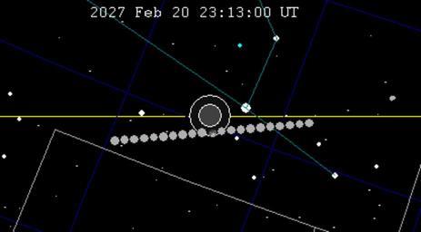 | Keywords: Lunar eclipse chart-2027Feb20.png en wikipedia 2011 October 24 February 2027 lunar eclipse chart The position of the moon and earth's shadow are shown as viewed from center of earth A small parallax effect occurs from specific location on surface of the earth The yellow line is the plane of the ecliptic path of the sun through the sky and hence the center of the earth's shadow The two concentric circles centered on this line show the extent of the umbra and penumbra the zones of full and partial shadow respectively for an object in the moon's orbit The moon is drawn at maximum eclipse and circles for every hour interval of motion thumb 2009-4-11 Own <br />Transferred from http //en wikipedia org en wikipedia SockPuppetForTomruen at http //en wikipedia org en wikipedia en wikipedia SockPuppetForTomruen Original upload log page en wikipedia Lunar_eclipse_chart-2027Feb20 png 2009-04-11 05 52 SockPuppetForTomruen 679×493 11367 bytes <nowiki> Summary February 2027 lunar eclipse chart The position of the moon and earth's shadow are shown as viewed from center of earth A small parallax effect occurs from specific location on surface of the earth The yellow line is the plane of t</nowiki> 2009-04-15 01 50 SockPuppetForTomruen 416×230 9264 bytes <nowiki>replace</nowiki> Lunar eclipse of 2008 February 21 1989 in astronomy 21st century lunar eclipses |