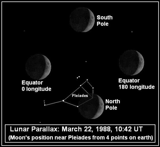 | Keywords: Lunarparallax 22 3 1988.png You can find the language-neutral modification of this image here Image Lunarparallax_22_3_1988_neutral png Example of lunar parallax from 4 points on earth This is a simulated image combining of 4 views of the sky and the moon's location relative to the background stars at a single point in time The bright stars visible are the star cluster Pleiades The date March 22 1988 was chosen because the moon occulted stars within the pleides as visible from North America NOTE This diagram is geometrically accurate although not physically possible to see since the moon was not actually above the horizon in half the views Specifically you can never see the Pleiades from the south pole They were just picked as extreme views from the earth the limit of what might be seen from a set of four locations in a square on a great circle and a moon just above the horizon in all four locations Credit Tom Ruen Full Sky Observatory This image was generated by my own solar system viewing software Source bitmap for projection from Nasa's Clementine Spacecraft USGS Global simple cylindrical projection at 10 km/pixel http //astrogeology usgs gov/Projects/Clementine/images/albedo simp750 jpeg Tomruen Source en Image Lunarparallax 22 3 1988 png history on en 02 12 21 May 2004 en user Tomruen 554x508 31311 bytes Example of lunar parallax from 4 points on earth Moon diagrams Parallax |