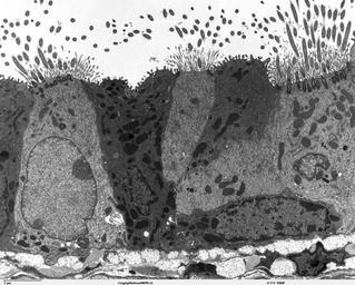 | Keywords: Lung epithelium 80294-2.6.jpg Transmission electron microscope image of a thin section cut through the bronchiolar epithelium of the lung mouse which consists of ciliated cells and non-ciliated cells called Clara cells Image shows the ciliary microtubules in transverse and oblique section In the cell apex are the basal bodies that are the anchoring sites for the ciliary axonemes Note the difference in size and shape between the microvilli and the cilia JEOL 100CX TEM http //remf dartmouth edu/imagesindex html http //remf dartmouth edu/images/mammalianLungTEM/source/13 html Louisa Howard Michael Binder PD Louisa Howard and Michael Binder Cell biology |