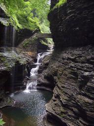 Keywords: Stream waterfall pools lush green foliage Watkins Glen State Park NY