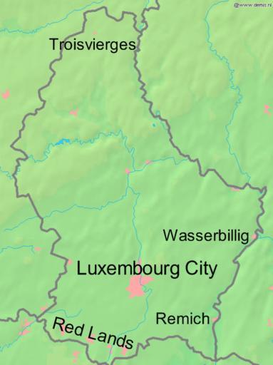 Keywords: Luxembourg World War I labelled.png A map of Luxembourg with some urban areas marked in salmon These urban areas from north to south are Troisvierges Wiltz Diekirch Ettelbruck Echternach Wasserbillig Steinfort Luxembourg City Remich Differdange Esch-sur-Alzette Dudelange and Rumelange Some of these towns were chosen to be demarcated to suit the purposes of the article w German occupation of Luxembourg in World War I so should not be seen as being the largest towns in the country Own work based on Image La2-demis-luxembourg png 2006-08-15 Bastin Released into the public domain See licence below Unlabelled version Image Luxembourg Demis 2 png Check categories 2008 November 19 en wikipedia German_occupation_of_Luxembourg_in_World_War_I Featured article Luxembourg in World War I Western Front maps of World War I Luxembourg |