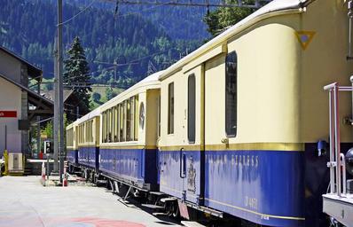 | Keywords: luxury train alpine classic pullman express rhaetian railways special train meter track railway station fiesch valais special crossing interruption switzerland alpine railway ferrovia retica world heritage tourism rhb trainstation narrow gauge mob matterhorn-oberalp-bahn coat of arms historically 1930s |