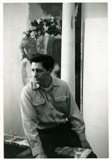 Keywords: Lyn Ott.jpg Lynfield Ott in his Woodstock New York art studio in 1964 the year he and his wife Phyllis heard of Meher Baba from Tom and Yvonne Riley The painted figure in the background is of Phyllis Ott painted by Lyn in 1963 or 1964 It was part of a 1965 exhibition at Lovisco Gallery in New York City The flowers in the painting are actual plastic flowers inserted into the painting All the paintings in the show were vertical and stood 9' high They included The Red Highheels with actual red highheels on a platform at floor level and The Secret with a locked box at the lower platform containing a hidden gold necklace All paintings in the show were sold Lyn Ott sent an invitation to the show to Meher Baba in India In reply Ott received a cable from Meher Baba which read 'I will be at your show viewing my reflection in your work ' PD-heirs Lyn Ott |