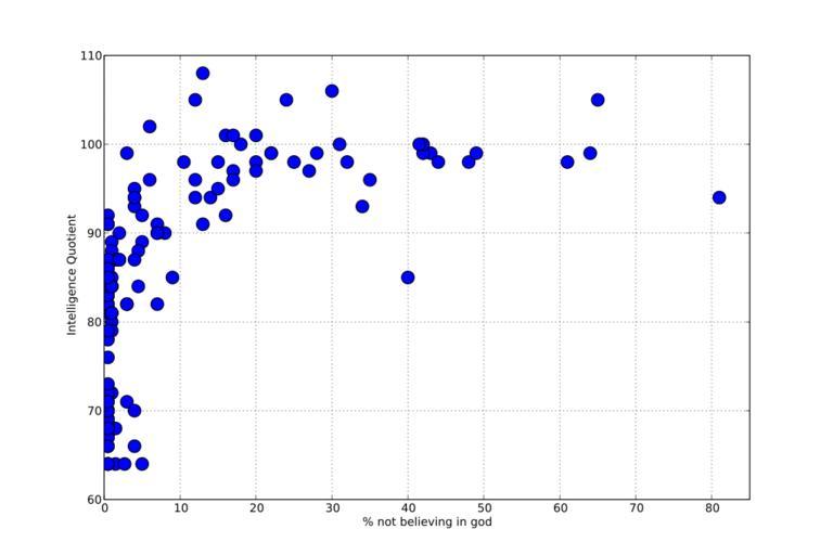 Keywords: LynnHarveyNyborg-CountryBelieveGod-Intelligence.svg Intelligence The data were plotted using the following Python script <source lang python > /usr/bin/env python from pylab import rc 'font' family 'sans-serif' rc 'figure' figsize 12 8 seriesBelief 0 5 8 0 0 5 1 5 4 0 14 0 25 0 18 0 0 5 0 5 17 0 43 0 0 5 1 0 0 5 1 0 0 5 34 0 0 5 0 5 7 0 0 5 22 0 1 5 0 5 2 0 12 0 1 0 2 7 1 0 0 5 7 0 40 0 61 0 48 0 7 0 1 0 0 5 1 0 49 0 0 5 28 0 44 0 0 5 4 0 42 0 0 5 16 0 1 0 0 5 0 5 1 0 32 0 16 0 3 0 1 5 4 5 0 5 5 0 15 0 6 0 3 0 65 0 0 5 12 0 0 5 0 5 7 0 5 0 20 0 3 0 0 5 0 5 13 0 0 5 0 5 0 5 0 5 0 5 4 5 6 0 20 0 0 5 5 0 4 0 0 5 42 0 22 0 1 0 0 5 0 5 31 0 0 5 0 5 1 0 1 0 1 0 0 5 3 0 4 0 4 0 27 0 0 5 0 5 0 5 0 5 13 0 17 0 35 0 0 5 1 0 30 0 15 0 0 5 64 0 17 0 0 5 24 0 2 0 0 5 0 5 0 5 9 0 0 5 2 0 0 5 20 0 0 5 41 5 10 5 12 0 4 0 1 0 81 0 0 5 0 5 4 0 seriesIQ 84 90 83 68 93 94 98 100 87 82 97 99 70 87 70 87 91 93 68 69 91 64 99 64 68 90 105 84 64 89 69 90 85 98 98 82 88 81 80 99 64 99 98 66 94 99 71 92 79 67 67 81 98 101 82 87 84 87 92 95 102 71 105 84 94 72 86 90 89 98 82 67 83 91 82 69 92 69 76 88 96 101 84 64 70 78 100 99 81 69 69 100 83 84 84 84 85 86 99 95 94 97 70 84 66 64 108 96 96 68 72 106 98 79 99 101 83 105 87 72 91 70 85 83 87 73 97 84 100 98 96 87 84 94 85 71 66 scatter seriesBelief seriesIQ 137 ; xlabel ' not believing in god' ylabel 'Intelligence Quotient' axis 0 85 60 110 grid True savefig 'LynnHarveyNyborg-CountryBelieveGod-Intelligence svg' </source> en wikipedia Oxyman CommonsHelper 2009-06-22 Paul rogers 1964 wikipedia en Created with Matplotlib Paul rogers 1964 Original upload log page en wikipedia LynnHarveyNyborg-CountryBelieveGod-Intelligence svg 2009-06-22 13 09 Paul rogers 1964 1080×720× 77108 bytes <nowiki>This is a graph created by myself using data from Appendix A in the paper Average intelligence predicts atheism rates across 137 nations by Richard Lynn John Harvey Helmuth Nyborg published in the journal Intelligence The</nowiki> Intelligence Religion and science Images with Python source code |