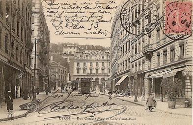 | Keywords: Lyon - Rue Octavio Mey et Gare Saint-Paul (flamme de 1904).jpg Rue Octavio-Mey et la gare Saint-Paul à Lyon vers 1900 Collection personnelle 1900 author Anonymous-EU Gare de Lyon-Saint-Paul Postcards of Lyon Ancien tramway de Lyon 1904 postcards of France Rue Octavio Mey Lyon Lyon in the 1900s |