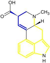 | Keywords: Lysergic acid colored.svg en Lysergic acid structural formula Blue portion comes from isoprene yellow - from tryptophan ru Ст укту ная фо мула лизе гиновой кислоты Синим обозначен ф агмент изоп ена жёлтым - т иптофана own Ring0 2009-10-17 Lysergic acid |