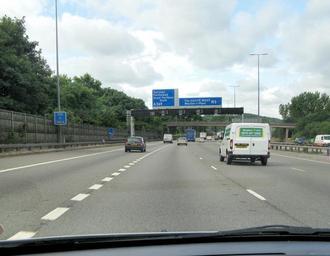 | Keywords: M5 motorway at gordano in bristol arp.jpg View from my car on the southbound M5 motorway approaching the Gordano Services just south of the Avonmouth Bridge Bristol England THE SLIP LANE on the left serves the Gordano Services and the A369 road marked by the closely-dashed white dashes with the dark car and white van on it The single diagonal line on a blue background indicates 100 metres to go before the exit useful in fog or rain The carriageway markings are the well-spaced-out white dashes THE OVERHEAD GANTRY says The SOUTH WEST meaning the south west of England The junction number is shown as 19 the next exit would be 20 for Clevedon Below the blue down-pointing arrows on the gantry crosses can be lit up to bar a carriageway THE BLUE NOTICE on the far left is not for the motorist it helps maintenance police planners etc locate a point on the motorway A means the southbound carriageway and 144 4 is a distance from a reference point Photographed by Adrian Pingstone in July 2009 and placed in the public domain 2009-07-06 own assumed Arpingstone M5 motorway Road signs in England Blue signs |
