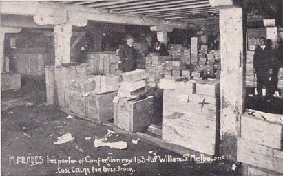| Keywords: morris mendes morrismendes confectioner confectionary warehouse william street williamstreet melbourne victoria australia basement store cellar stonework architecture outdoor 163 William Street, Melbourne, Victoria. Cool cellar for bulk stock. Article about a fire in this warehouse in 1917: trove.nla.gov.au/ndp/del/article/155197297?searchTerm=men... 163 William Street, Melbourne, Victoria. Cool cellar for bulk stock. Article about a fire in this warehouse in 1917: trove.nla.gov.au/ndp/del/article/155197297?searchTerm=men... |