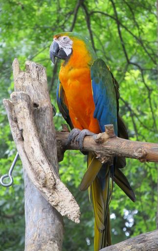 Keywords: macaw parrot bird colorful feather perched tropical wings portrait looking