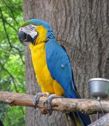 Keywords: macaw parrot bird colorful feather perched tropical blue yellow wings portrait looking