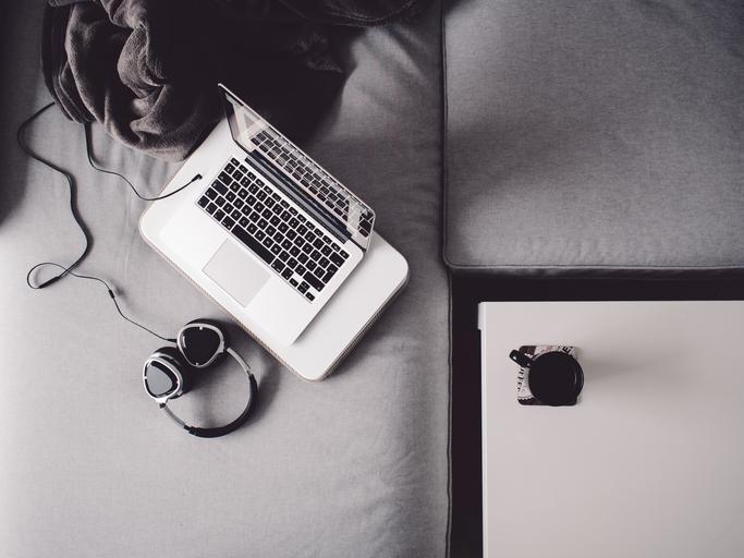Keywords: macbook laptop headphones deck black and white modern couch table cup mug coffee