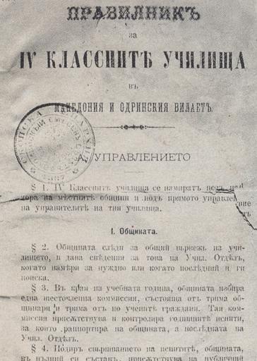 Keywords: Macedonia-Odrin-4-class-schools-regulations.jpg П авилник на IV-класните училища от акедония и Од инския вилает пъ ва ст аница Scanned from Encyclopedia History of Bulgaria Vol 7 p 434 Author PD-old Historical documents of Bulgaria
