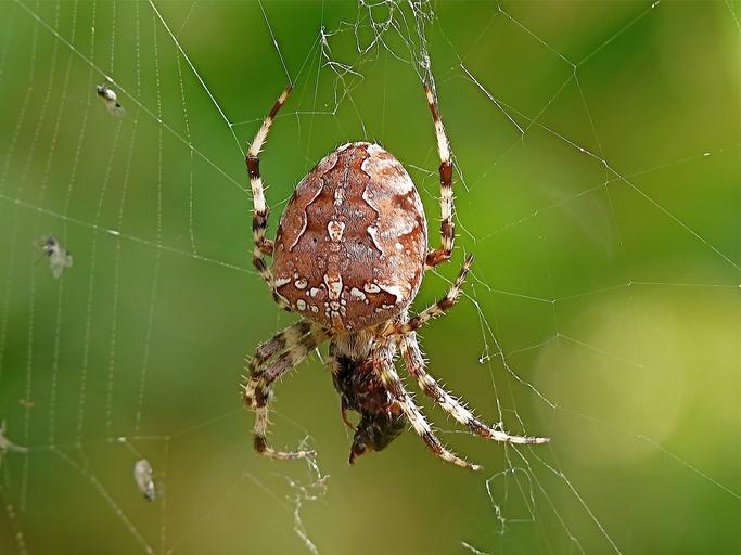 Keywords: macro insect macro photography close nature spider web spider creepy arachnophobisch cobweb network green background silk thread animal persepktive garden thread