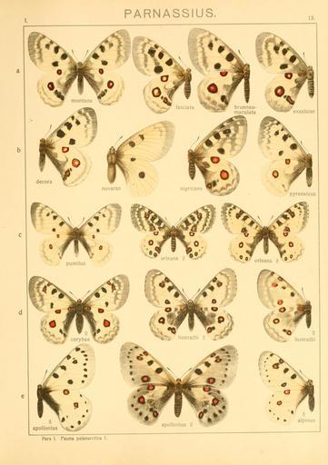| Keywords: Macrolepidoptera01seitz 0033.jpg Stichel in Seitz 1906 Parnassius Plate Tab 13 Plate from Seitz A Ed 1900-1909 Die Großschmetterlinge der Erde Verlag Alfred Kernen Stuttgart Die Großschmetterlinge des palaearktischen Faunengebietes The Macrolepidoptera of the world a systematic account of all the known Macrolepidoptera Band 1 Abt 1 Die Großschmetterlinge des palaearktischen Faunengebietes Die palaearktischen Tagfalter https //archive org/details/diegrossschmette01seit read text in German See The Global Lepidoptera Names Index for valid names montana Parnassius apollo Linnaeus 1758 ab montana Stichel aberration at 1860 m from the Stilfser Joch road in the Southern Tyrol fasciata Parnassius apollo Linnaeus 1758 ab fasciata Stichel aberration brunneomaculata Parnassius apollo Linnaeus 1758 aberration ab brunneomaculata Stichel excelsior Parnassius apollo Linnaeus 1758 ab excelsior Stichel aberration decora Parnassius apollo Linnaeus 1758 ab decora Schultz aberration specimens with an abundance of red within the anal spots of hindwing belong this occurring not rarely in the females sparingly in the males novarae ab Parnassius apollo Linnaeus 1758 ab novarae Oberth the elimination of the red colour is accompanied in the less well-known males also by a disappearance of the costal spots and the hindmarginal spot of the forewing in the type-specimen even the anterior ocellus of the hindwing being missing aberration nigricans Parnassius apollo Linnaeus 1758 ab nigricans Caradja a name for specially strongly melanistic females temperature form pyrenaicus Parnassius apollo Linnaeus 1758 form pyrenaicus Harc pumilus Parnassius apollo Linnaeus 1758 form pumilus Stich dwarfed form from Sicily orleans Parnassius orleans Oberthur 1890 corybas Parnassius apollo Linnaeus 1758 form corybas Fisch Kamtchatka honrathi Parnassius honrathi Staudinger and A Bang-Haas 1882 apollonius Parnassius apollonius Eversmann 1847 alpinus Parnassius apollonius Eversmann 1847 race alpinus Stgr A small lighter coloured race with smaller submarginal spots http //www archive org/details/macrolepidoptera01seitz 1906 Creator Adalbert Seitz Author died more than 70 years ago - public domain PD-old The Macrolepidoptera of the World Fauna Palearctica Parnassius |