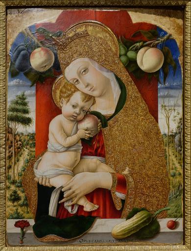 | Keywords: Madonna col Bambino Carlo Crivelli GAC.jpg  Art Photo Creator Carlo Crivelli Madonna and Child holding an apple; on the sill a cucumber symbol of the Resurrection a carnation and a cherry symbols of the Christ's Passion ca 1480 1483 tempera panel Institution Accademia Carrara Bergamo object history Guglielmo Lochis credit line ProvenanceEvent bequest Guglielmo Lochis 1866 accession number own photo date 2015-09-10 Marie-Lan Nguyen artwork license PD-old-100-1923 photo license other versions Madonna and Child with an apple by Carlo Crivelli Galleria dell'Accademia Carrara Bergamo Taken with Nikon D800E Taken with AF-S Zoom-Nikkor 24-70mm f/2 8G ED |