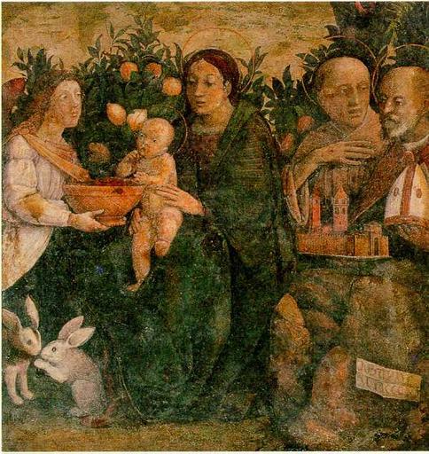 Keywords: Madonna col Bambino i Santi Francesco e Quirino.jpg Madonna col Bambino i Santi Francesco e Quirino Affresco attribuito a Antonio Allegri con i Santi che tengono in mano la città di Correggio Affresco trasportato su tela cm 112 x 94 1507-11 Modena Galleria Estense Foto Manzotti E' tradizione che l'affresco sia stato eseguito per l'antica chiesa di San Quirino annessa al castello dei da Correggio In occasione dell'abbattimento di detta chiesa nel 1514 il dipinto venne salvato con l'intero pezzo di muro retrostante e portato in Santa Maria della Misericordia Le successive vicende lo hanno collocato presso la Galleria Estense trasferito su tela dove attualmente giace nei depositi Si tratta di una delle prime opere documentate dell'Allegri eseguita forse nel 1507 come suggerisce il Quintavalle e rifinita nel 1511 secondo la data che appare in basso a destra Risulta evidente il momento mantegnesco del giovane pittore sottolineato da una notevole libertà e freschezza Non compaiono i vincoli architettonici la Madonna e i Santi conversano spontaneamente in un giardino signorile presso una siepe di cedri mentre i conigli mimano un incontro effusivo L'opera è molto legata alla città natale Il giardino è probabilmente quello dei Conti; i due santi sono i più amati dai correggesi; e San Quirino di cui la dinastia locale sta rinnovando il culto regge una esplicita dedicatio urbis ovvero l'immagine della città offertagli in protezione Quest'ultimo elemento oltre ad essere un prezioso documento urbanistico ci tramanda il segno della ascesa di Correggio al ruolo di vera piccola capitale own Icco80 Paintings of Francis of Assisi Saint Quirinus of Sescia Paintings in the Galleria estense Modena |