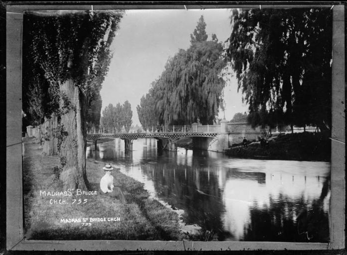 | Keywords: blackandwhite photo border monochrome serene outdoor black and white View of the Madras Street Bridge across the Avon River, Christchurch. A young woman wearing a white blouse, dark-coloured skirt, and boater hat, is sitting on the grass beside the river, in the left foreground. Photograph taken by William A Price ca 1910. Inscriptions: Inscribed - Photographer's title on negative -bottom left: Madras St. Bridge. Chch. [No.] 755.. Quantity: 1 b&w original negative(s). Physical Description: Dry plate glass negative Madras Street Bridge across the Avon River, Christchurch. Price, William Archer, 1866-1948 :Collection of post card negatives. Ref: 1/2-000852-G. Alexander Turnbull Library, Wellington, New Zealand. natlib.govt.nz/records/22794500 View of the Madras Street Bridge across the Avon River, Christchurch. A young woman wearing a white blouse, dark-coloured skirt, and boater hat, is sitting on the grass beside the river, in the left foreground. Photograph taken by William A Price ca 1910. Inscriptions: Inscribed - Photographer's title on negative -bottom left: Madras St. Bridge. Chch. [No.] 755.. Quantity: 1 b&w original negative(s). Physical Description: Dry plate glass negative Madras Street Bridge across the Avon River, Christchurch. Price, William Archer, 1866-1948 :Collection of post card negatives. Ref: 1/2-000852-G. Alexander Turnbull Library, Wellington, New Zealand. natlib.govt.nz/records/22794500 |