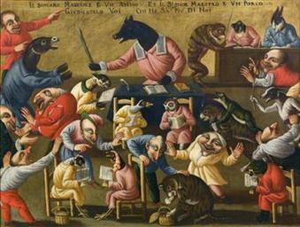 | Keywords: Maestro della Fertilità dell'Uovo - Grotesque scene with animals and stylised figures.jpg Artwork creator Maestro della Fertilità dell'Uovo en Grotesque scene with animals and stylised figures inscribed žIl scolaro maggiore è un asino - e il maestro è un porco - giudicatelo voi - chi ne sa più di noi 17th century http //www dorotheum com/ru/ru/auktionen/auktionstermine/aktuelle-auktionen/kataloge/list-lots-detail/auktion/10841-old-master-paintings/lotID/420/lot/1776023-maestro-della-fertilita-delluovo html oil canvas cm 90 120 Sold at Dorotheum on 21 October 2014 lot 420 Other versions PD-old-100 Maestro della Fertilità dell'Uovo Images from Dorotheum Animals acting as humans in art Animals with human clothing Kitchens in art World upside down |
