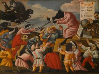 | Keywords: Maestro della Fertilità dell'Uovo - Grotesque Scene with Animals and Stylised Figures No. 1.jpg Artwork creator Maestro della Fertilità dell'Uovo en Grotesque Scene with Animals and Stylised Figures No 1 17th century http //www ruzhnikov com/grotesque-scene-with-animals-and-stylised-figures-1/ oil canvas cm 90 120 The Ruzhnikov Collection Other versions PD-old-100 Maestro della Fertilità dell'Uovo Animals acting as humans in art Animals with human clothing World upside down | ||||
