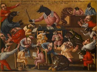 | Keywords: Maestro della Fertilità dell'Uovo - Grotesque Scene with Animals and Stylised Figures No. 2.jpg Artwork creator Maestro della Fertilità dell'Uovo en Grotesque Scene with Animals and Stylised Figures No 2 17th century http //www ruzhnikov com/grotesque-scene-with-animals-and-stylised-figures-2/ oil canvas cm 90 120 The Ruzhnikov Collection Other versions PD-old-100 Maestro della Fertilità dell'Uovo Animals acting as humans in art Animals with human clothing World upside down | ||||