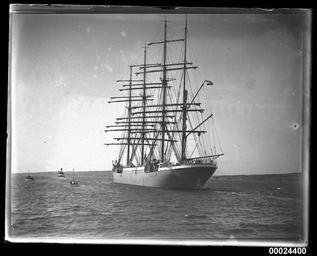 | Keywords: samuel j hood collection samueljhoodcollection barque magdalene vinnen magdalenevinnen harbour scenes harbourscenes sydney harbour sydneyharbour foreign vessel foreignvessel merchant vessel merchantvessel masts ship blackandwhite photo border monochrome sea black and white The four-masted steel barque, MAGDALENE VINNEN, was built in 1921 in Kiel, Germany for F A Vinnen and Company in Bremen. On 27 February 1933, under the command of Captain Lorenz Peters, MAGDALENE VINNEN sailed into Sydney Harbour. The masts were too tall to allow the vessel to pass under the Harbour Bridge to be berthed in Pyrmont, so it was moved to Number 2 wharf in Woolloomooloo. The barque was loaded with almost 16,000 bales of wool, the fourth largest shipment to have left Sydney, before it sailed the record-breaking 82-day voyage for Falmouth, England. The barque visited Australia again in 1935, with its cargo being wheat, lifted from Port Broughton in South Australia. The following year, the vessel was sold to Norddeutscher Lloyd, Bremen, renamed KOMMODORE JOHNSEN and used as a cargo carrier and sail-training ship. In 1945, the ship was awarded to the Soviet Union as war compensation and renamed SEDOV. When it was first built, it was the largest auxiliary barque in the world. To this day, it is still in operation and in 2011, it retained its ranking as the largest tall ship in the world. This photo is part of the Australian National Maritime Museum’s Samuel J. Hood Studio collection. Sam Hood (1872-1953) was a Sydney photographer with a passion for ships. His 60-year career spanned the romantic age of sail and two world wars. The photos in the collection were taken mainly in Sydney and Newcastle during the first half of the 20th century. The ANMM undertakes research and accepts public comments that enhance the information we hold about images in our collection. This record has been updated accordingly. Photographer: Samuel J. Hood Studio Collection Object no. 00024400 The four-masted steel barque, MAGDALENE VINNEN, was built in 1921 in Kiel, Germany for F A Vinnen and Company in Bremen. On 27 February 1933, under the command of Captain Lorenz Peters, MAGDALENE VINNEN sailed into Sydney Harbour. The masts were too tall to allow the vessel to pass under the Harbour Bridge to be berthed in Pyrmont, so it was moved to Number 2 wharf in Woolloomooloo. The barque was loaded with almost 16,000 bales of wool, the fourth largest shipment to have left Sydney, before it sailed the record-breaking 82-day voyage for Falmouth, England. The barque visited Australia again in 1935, with its cargo being wheat, lifted from Port Broughton in South Australia. The following year, the vessel was sold to Norddeutscher Lloyd, Bremen, renamed KOMMODORE JOHNSEN and used as a cargo carrier and sail-training ship. In 1945, the ship was awarded to the Soviet Union as war compensation and renamed SEDOV. When it was first built, it was the largest auxiliary barque in the world. To this day, it is still in operation and in 2011, it retained its ranking as the largest tall ship in the world. This photo is part of the Australian National Maritime Museum’s Samuel J. Hood Studio collection. Sam Hood (1872-1953) was a Sydney photographer with a passion for ships. His 60-year career spanned the romantic age of sail and two world wars. The photos in the collection were taken mainly in Sydney and Newcastle during the first half of the 20th century. The ANMM undertakes research and accepts public comments that enhance the information we hold about images in our collection. This record has been updated accordingly. Photographer: Samuel J. Hood Studio Collection Object no. 00024400 |