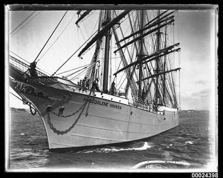 | Keywords: samuel j hood collection samueljhoodcollection barque magdalene vinnen magdalenevinnen foreign vessel foreignvessel sydney harbour sydneyharbour harbour scenes harbourscenes merchant vessel merchantvessel blackandwhite photo border monochrome vehicle boat black and white The four-masted steel barque, MAGDALENE VINNEN, was built in 1921 in Kiel, Germany for F A Vinnen and Company in Bremen. On 27 February 1933, under the command of Captain Lorenz Peters, MAGDALENE VINNEN sailed into Sydney Harbour. The masts were too tall to allow the vessel to pass under the Harbour Bridge to be berthed in Pyrmont, so it was moved to Number 2 wharf in Woolloomooloo. The barque was loaded with almost 16,000 bales of wool, the fourth largest shipment to have left Sydney, before it sailed the record-breaking 82-day voyage for Falmouth, England. The barque visited Australia again in 1935, with its cargo being wheat, lifted from Port Broughton in South Australia. The following year, the vessel was sold to Norddeutscher Lloyd, Bremen, renamed KOMMODORE JOHNSEN and used as a cargo carrier and sail-training ship. In 1945, the ship was awarded to the Soviet Union as war compensation and renamed SEDOV. When it was first built, it was the largest auxiliary barque in the world. To this day, it is still in operation and in 2011, it retained its ranking as the largest tall ship in the world. This photo is part of the Australian National Maritime Museum’s Samuel J. Hood Studio collection. Sam Hood (1872-1953) was a Sydney photographer with a passion for ships. His 60-year career spanned the romantic age of sail and two world wars. The photos in the collection were taken mainly in Sydney and Newcastle during the first half of the 20th century. The ANMM undertakes research and accepts public comments that enhance the information we hold about images in our collection. This record has been updated accordingly. Photographer: Samuel J. Hood Studio Collection Object no. 00024398 The four-masted steel barque, MAGDALENE VINNEN, was built in 1921 in Kiel, Germany for F A Vinnen and Company in Bremen. On 27 February 1933, under the command of Captain Lorenz Peters, MAGDALENE VINNEN sailed into Sydney Harbour. The masts were too tall to allow the vessel to pass under the Harbour Bridge to be berthed in Pyrmont, so it was moved to Number 2 wharf in Woolloomooloo. The barque was loaded with almost 16,000 bales of wool, the fourth largest shipment to have left Sydney, before it sailed the record-breaking 82-day voyage for Falmouth, England. The barque visited Australia again in 1935, with its cargo being wheat, lifted from Port Broughton in South Australia. The following year, the vessel was sold to Norddeutscher Lloyd, Bremen, renamed KOMMODORE JOHNSEN and used as a cargo carrier and sail-training ship. In 1945, the ship was awarded to the Soviet Union as war compensation and renamed SEDOV. When it was first built, it was the largest auxiliary barque in the world. To this day, it is still in operation and in 2011, it retained its ranking as the largest tall ship in the world. This photo is part of the Australian National Maritime Museum’s Samuel J. Hood Studio collection. Sam Hood (1872-1953) was a Sydney photographer with a passion for ships. His 60-year career spanned the romantic age of sail and two world wars. The photos in the collection were taken mainly in Sydney and Newcastle during the first half of the 20th century. The ANMM undertakes research and accepts public comments that enhance the information we hold about images in our collection. This record has been updated accordingly. Photographer: Samuel J. Hood Studio Collection Object no. 00024398 |