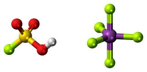 | Keywords: Magic acid 3D ball.png Ball-and-stick models of the fluorosulfuric acid molecule left and antimony pentafluoride right which combine to form a superacid called magic acid Colour code F0F0F0 Hydrogen H white<br> F51E1E Oxygen O red<br> C8FA00 Yellow-green Fluorine F<br> FAEB00 Sulfur S yellow<br> AA5ABE Antimony Sb lilac<br> 2011-06-24 own DS Visualizer Jynto talk Space-filling version cc-zero Superacids fluorosulfuric acid antimony pentafluoride Images by Jynto | ||||