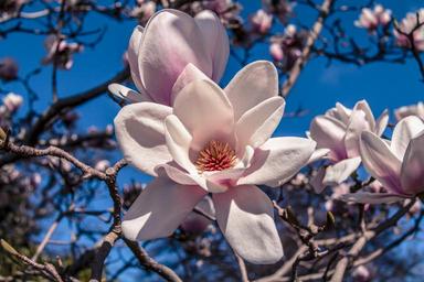 | Keywords: tree plant blossom outdoor cherry blossom flower Magnolia is a large genus of about 210[notes 1] flowering plant species in the subfamily Magnolioideae of the family Magnoliaceae. It is named after French botanist Pierre Magnol. Magnolia is an ancient genus. Appearing before bees did, the flowers are theorized to have evolved to encourage pollination by beetles. To avoid damage from pollinating beetles, the carpels of Magnolia flowers are extremely tough.[1] Fossilised specimens of M. acuminata have been found dating to 20 million years ago, and of plants identifiably belonging to the Magnoliaceae date to 95 million years ago.[2] Another aspect of Magnolia considered to represent an ancestral state is that the flower bud is enclosed in a bract rather than in sepals; the perianth parts are undifferentiated and called tepals rather than distinct sepals and petals. Magnolia shares the tepal characteristic with several other flowering plants near the base of the flowering plant lineage such as Amborella and Nymphaea (as well as with many more recently derived plants such as Lilium). The natural range of Magnolia species is a disjunct distribution, with a main centre in east and southeast Asia and a secondary centre in eastern North America, Central America, the West Indies, and some species in South America. en.wikipedia.org/wiki/Magnolia Magnolia is a large genus of about 210[notes 1] flowering plant species in the subfamily Magnolioideae of the family Magnoliaceae. It is named after French botanist Pierre Magnol. Magnolia is an ancient genus. Appearing before bees did, the flowers are theorized to have evolved to encourage pollination by beetles. To avoid damage from pollinating beetles, the carpels of Magnolia flowers are extremely tough.[1] Fossilised specimens of M. acuminata have been found dating to 20 million years ago, and of plants identifiably belonging to the Magnoliaceae date to 95 million years ago.[2] Another aspect of Magnolia considered to represent an ancestral state is that the flower bud is enclosed in a bract rather than in sepals; the perianth parts are undifferentiated and called tepals rather than distinct sepals and petals. Magnolia shares the tepal characteristic with several other flowering plants near the base of the flowering plant lineage such as Amborella and Nymphaea (as well as with many more recently derived plants such as Lilium). The natural range of Magnolia species is a disjunct distribution, with a main centre in east and southeast Asia and a secondary centre in eastern North America, Central America, the West Indies, and some species in South America. en.wikipedia.org/wiki/Magnolia |