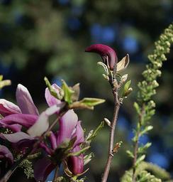 Keywords: magnolia flower magnolia flower spring flourishing flowers violet pink petals leaflet twigs early flowering buds in bloom magnolia branches flower buds closeup plant nature sunny the background