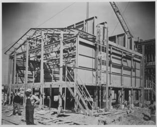 | Keywords: steel steel industry steelindustry steel construction steelconstruction construction industry constructionindustry construction equipment constructionequipment buildings blackandwhite monochrome outdoor building architecture photo border building structure black and white Photograph of construction of a Magnolia Petroleum Company building, being built by Alcorn Combustion Company, showing a steel structure by John Dollinger Jr., Inc. Two men are standing near the structure on the left and another is on the far right side of the photograph. Two workers can be seen within the building on the left, each wearing a hard hat. A crane at the top of the structure says "The Lummus Company." Several stacks of lumber are seen scattered in areas around the site. John Dollinger Jr., Inc. also provided breechings and a stack for a heater for the project. Photograph of construction of a Magnolia Petroleum Company building, being built by Alcorn Combustion Company, showing a steel structure by John Dollinger Jr., Inc. Two men are standing near the structure on the left and another is on the far right side of the photograph. Two workers can be seen within the building on the left, each wearing a hard hat. A crane at the top of the structure says "The Lummus Company." Several stacks of lumber are seen scattered in areas around the site. John Dollinger Jr., Inc. also provided breechings and a stack for a heater for the project. |
