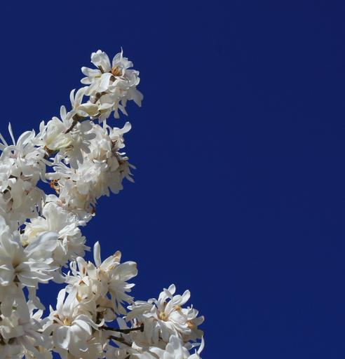 Keywords: magnolia tree white flower springtime spring blue sky shrub spring flower sunlight nature