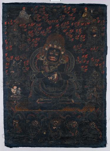 Keywords: Mahakala, Protector of the Tent, black.jpg Mahakala Protector of the Tent Tibet Distemper and gold on blue silk Image 29 x 20 1/2 in 73 7 x 52 1 cm Overall 30 1/4 x 21 3/4 in 76 8 x 55 2 cm This black-ground painting is a visualization image of Mahakala as Panjarantha the enlightened protector of Buddhism He tramples a male corpse beneath his feet and displays a flaying knife kartrika in his right hand and a skull cup kapala in his left implements for cutting through delusions and ignorance A ritual wand gandi is balanced in the crooks of his arms Panjaranatha is understood as the original Mahakala from which all other manifestations emanate Several of the latter along with the deity ™s associates surround him including Brahmarupa the lesser Mahakala at left blowing a thighbone trumpet and Palden Lhamo Mahakala ™s consort riding her mule In the upper corners are two hierarchs of the Sakya lineage over which Mahakala presides as their principal protector and below his fearful retinue dances macabrely http //www metmuseum org/collection/the-collection-online/search/73202 http //images metmuseum org/CRDImages/as/original/DP135204 jpg direct link 1650 author PD-old-100 Mandala thangka from Tibet Tibetan Buddhist paintings in the Metropolitan Museum of Art 17th-century paintings from Tibet Files uploaded by Yann Forget |