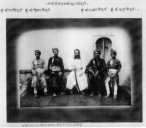 | Keywords: Maharaj Surat Singhji of Karjali with his sons.jpg en The earliest photographer of Udaipur Madan Lal took this family portrait in the year AD 1888 of Maharaj Surat Singhji of Karjali Center with his four sons L-R Kr Tej Singh followed by the eldest son Kr Himmet Singh and second son Kr Laxman Singh followed by young Bavji own Suryaindia009 Bavji Chatur Singhji 1888 in India | ||||