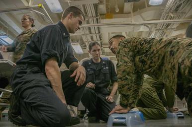 | Keywords: Maiden deployment, USS San Diego 150207-N-QC631-011.jpg en PACIFIC OCEAN Feb 07 2015 Hospital Corpsman 2nd Class Levi Arcaira from Bremerton Washington instructs Sailors how to perform chest compressions during a cardiac pulmonary resuscitation CPR class in the medical ward aboard the amphibious transport dock ship USS San Diego LPD 22 San Diego part of the Makin Island Amphibious Ready Group is on a deployment with the 11th Marine Expeditionary Unit to promote peace and freedom of the seas by providing security and stability in the 7th Fleet area of operations U S Navy photo by Mass Communication Specialist 3rd Class Gerald Dudley Reynolds/Released 2015-02-06 Petty Officer 3rd Class Gerald Dudley Reynolds https //www dvidshub net/image/1758611 150207-N-QC631-011 2015-02-08 21 38 PACIFIC OCEAN PD-USGov-Military-Navy 11th Marine Expeditionary Unit USS San Diego LPD-22 Images from DoD uploaded by FĂŚ |