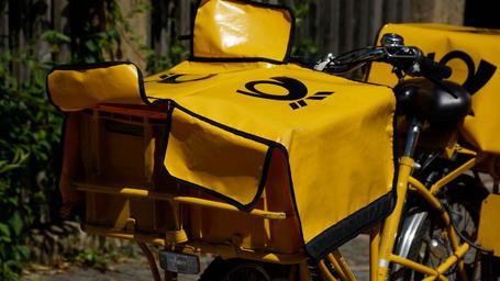 Keywords: mail bike bicycle delivery letters yellow german post saddlebag post horn deutsche post service send