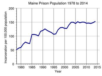 | Keywords: Maine Prison Population.svg en Maine prison incarceration rate per 100 000 population from 1978 to 2014 Maine has the lowest incarceration rate in the country Data from http //www bjs gov/index cfm ty nps BJS 2016-05-10 own Delphi234 other versions current annually Generated with Wikimedia SVG Chart SVG Chart/box cc-zero Demographics of Maine Imprisonment and detention rates in the United States | ||||