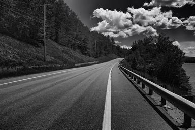 Keywords: maine road forest trees sky clouds black and white outside nature countryside lake water summer