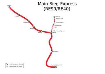 | Keywords: MainSiegExpress-RE40.svg en map of the RegionalExpress-line 40 Main-Sieg-Express in the German state of Hesse de Streckenkarte der Linie RE 40 žMain-Sieg-Express in Hessen und NRW own Zeeuwsebad 2011-02-23 Rail transport maps of Hesse Rail transport maps of North Rhine-Westphalia Named passenger trains of Germany |