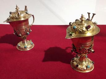 | Keywords: Mair Pair of cruets set with gemstones 02.jpg Artwork Creator Michael Mair between 1695 1700 gilt turquoise garnet topazes amethysts silver cm 14 5 11 5 Institution Museum of the Warsaw Archdiocese 0 accession number MAW-6731 object history ProvenanceEvent 1701 gift Cathedral of Saint John Warsaw Justynian BartÅ‚omiej Zaruski abbot of Sulejów ProvenanceEvent 1938 transfer Museum of the Warsaw Archdiocese ProvenanceEvent 1944 theft Nazi Germany ProvenanceEvent 1952 restitution PRL Poland ProvenanceEvent 1952 deposit National Museum in Warsaw ProvenanceEvent 1998 transfer Museum of the Warsaw Archdiocese credit line The handles of cruets are the form of the letters V for the Latin vinum “ wine and A for the Latin aqua “ water to avoid confusing their contents http //poland2015 chnmuseum cn/en/ poland2015 chnmuseum cn https //pl pinterest com/pin/418905202819377167/ pl pinterest com own Cc-zero DEFAULTSORT 1695-1700; Pair of cruets set with gemstones Pair of cruets by Michael Mair Museum of the Warsaw Archdiocese |