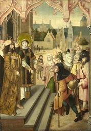 | Keywords: Maître de la Légende de sainte Ursule Cycle de saint Laurent 4. Laurent montre au préfet les trésors de l'église.jpg en Circle of the Master of the Saint Ursula Legend Cologne active late 15th/early 16th century Saint Lawrence showing the Prefect the Treasures of the Church about 1510 Oil on canvas 130 2 x 92 7 cm Presented by Sir Henry Howorth through The Art Fund in memory of Lady Howorth 1922 NG3665 http //www nationalgallery org uk/paintings/NG3665 2005-01-24 18 55 03 London National Gallery n° 3665 http //www nationalgallery org uk/paintings/circle-of-the-master-of-the-saint-ursula-legend-cologne-saint-lawrence-before-the-prefect Maître de la Légende de sainte Ursule vers 1498 other versions Custom license marker 2016 02 06 PD-old-100 Master of the Cologne legend of St Ursula Saint Lawrence churches |