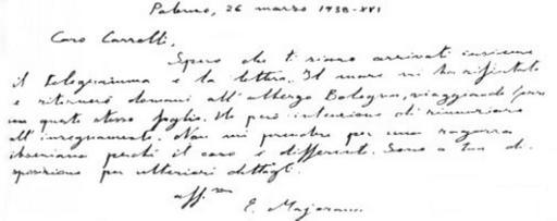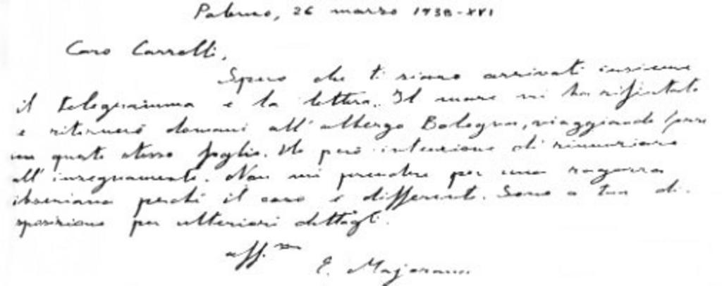 | Keywords: Majorana Last letter.jpg ibseniana perché il caso è differente Sono a tua disposizione per ulteriori dettagli http //www cataniaperte com/scienza/ettoremajorana/sinistra htm Ettore Majorana 1906-1938 1938 3 26 PD-Old Ettore Majorana Manuscript letters written messages Fascist calendar - Year XVI ImageNote 1 12 2 488 191 505 200 2 Palermo 26 marzo 1938 - XVI Caro Carrelli Antonio n d r Spero ti siano arrivati insieme il telegramma e la lettera Il mare mi ha rifiutato e ritornerò domani all'albergo Bologna viaggiando forse con questo stesso foglio Ho però intenzione di rinunziare all'insegnamento Non mi prendere per una ragazza ibseniana perché il caso è differente Sono a tua disposizione per ulteriori dettagli Aff mo E Majorana ImageNoteEnd 1 |