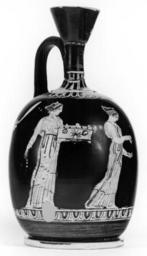 | Keywords: Makaria Painter - Squat Lekythos Depicting Eutychia, Eunomia and Paidia - Walters 48205 - Three Quarter Left.jpg This squat lekythos depicts Eutychia Eunomia and Paidia On the left Eutychia stands frontally looking right She holds a chest on her left forearm at waist level; her right hand hangs down by her side holding a necklace She wears a girded peplos diadem necklace earring and bracelets Next is Eunomia who walks solemnly to the right holding a necklace between her outstretched hands She wears a girded peplos necklace bracelets earring diadem and a decorated band which holds her hair in place On the right Paidia stands turned partially to the left holding a chest She wears a girded peplos necklace earring and bracelets; her hair is tied in back A diphros with a thick patterned cushion stands beside her The personifications on this vase from left to right are to be understood as Good Luck Good Order and Games and Play They are depicted as normal Athenian women and do nothing which might associate their actions with the literal meanings of their names ca 420 BC Classical terracotta H 8 x Max Diam 4 1/2 in 20 3 x 11 4 cm ; Diam at mouth cm 4 3 ; Diam at foot cm 8 4 accession number 48 205 3794 Joseph Brummer New York date and mode of acquisition unknown Henry Walters city Baltimore Walters Art Museum Henry Walters Acquired by Henry Walters 1925 Transliteration By the figures Eutychia Eunomia Paidia place of origin Attica Greece Walters Art Museum license Ancient Greek red-figure pottery in the Walters Art Museum Makaria Painter Media contributed by the Walters Art Museum needs category review Media contributed by the Walters Art Museum needs artist update Women in ancient Greek pottery |