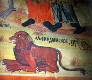 | Keywords: Makedonsko carstvo - Banjani.png mk Дел од ф еска на македонски лав и натпис акедонско Ца ство во ц квата Св Великомаченик и Победоносец Ѓо гија од XVI век во селото Бањани кое се наоѓа во подножјето на Скопска Ц на Го а http //issuu com/makedonska_riznica/docs/makedonska_riznica_15 author 1549 PD-Macedonia St George's Church Banjani Frescos in the Republic of Macedonia Paintings of lions | ||||